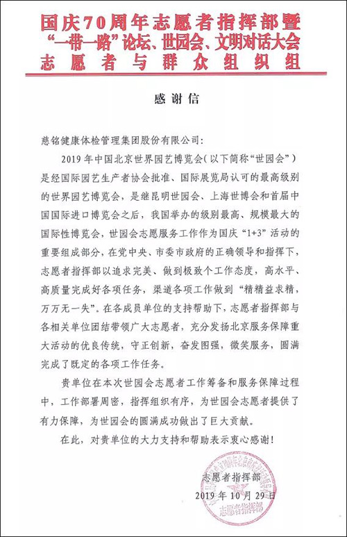 微笑服務,健康護航,慈銘體檢助力世園會圓滿落幕 2019.11.07