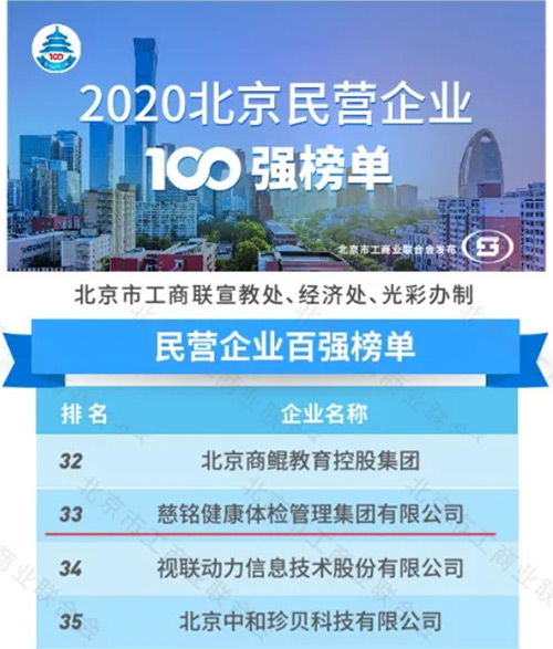 慈銘體檢榮獲“2020北京民營企業社會責任百強”稱號 2020.10.13
